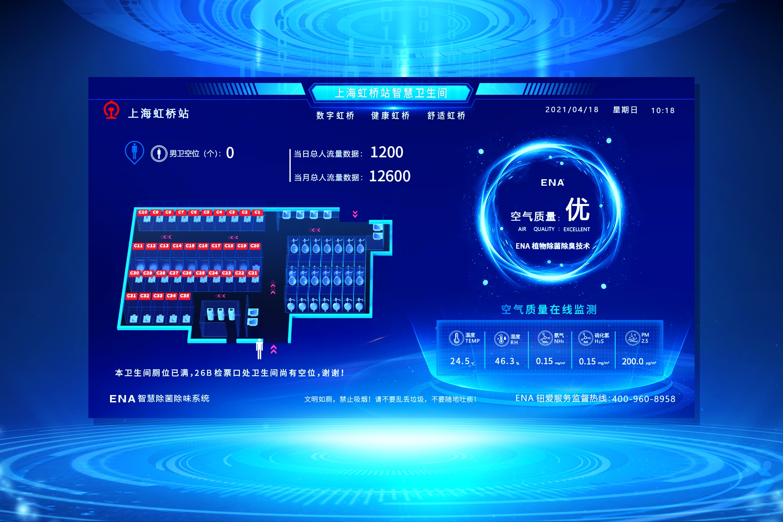 智能顯示屏上(shang)廁位使(shi)用圖,配合隔間(jian)(jian)門上(shang)雙色指示燈,引導如廁者快速找到空位。如當前衛(wei)生(sheng)間(jian)(jian)暫無空廁位,可(ke)引導如廁者至就近衛(wei)生(sheng)間(jian)(jian)如廁。